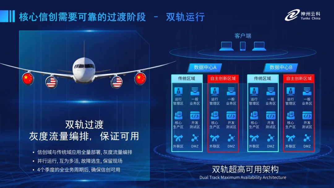 为帮助客户更好地应对数字经济时代对应用可持续性的高要求,实现信创与数字化兼得,k8凯发推出了双轨超高可用架构。双轨超高可用架构在双活数据中心的分区调度基础上,增加信创域和非信创域的分域调度,实行信创域与传统域应用全量部署,使双中心运营变为双中心四区域并行运行,互为多活,将传统架构变为分区分域协同的多活双轨超高可用架构。帮助客户在新架构下,保障“信创”的同时解决性能瓶颈,提升稳定性,保证应用可持续性,最终实现信创区域和非信创区域的平滑过渡,完成国产化替代目标。”